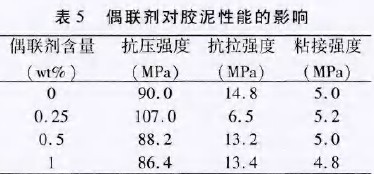 適當(dāng)?shù)慕缑娼Y(jié)合強(qiáng)度不僅有利于提高材料的整體強(qiáng)度,更重要的是便于將基體所承受的載荷通過界面?zhèn)鬟f給增強(qiáng)基質(zhì)。若結(jié)合強(qiáng)度太低,界面很難傳遞載荷,不能充分發(fā)揮填料的增強(qiáng)作用,影響復(fù)合材料的整體強(qiáng)度。界面結(jié)合強(qiáng)度主要取決于基體與填料表面結(jié)合的性質(zhì)以及填料表面狀態(tài)。選取磷酸苯胺為固化劑,按呋喃樹脂.膠泥粉質(zhì)量為I:2.5配制膠泥,配制時在膠泥中加入不同量的氧硅烷偶聯(lián)劑。在室溫下,按一定的時間固化、養(yǎng)護(hù)后,測試固化膠泥的力學(xué)性能,偶聯(lián)劑對膠泥性能的影響如表5所示,從表5中可以看出,在一定范圍內(nèi),偶聯(lián)劑的加入可以增加膠泥的抗壓、抗拉和粘結(jié)強(qiáng)度,但是當(dāng)偶聯(lián)劑的量很過0.25%時,膠泥的抗壓、抗拉和粘接強(qiáng)度反而下降,說明偶聯(lián)劑的加入量要適量,否則會降低膠泥的性能。較好的偶聯(lián)劑添加量為0.25%。