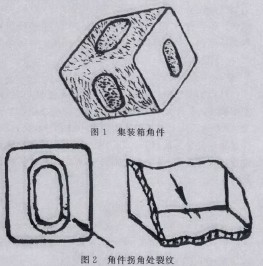 集裝箱角件(圖1)內(nèi)壁要求凹陷鑄字,精度在0~1.5mm內(nèi)變動。我們選用呋喃自硬砂和CO2水玻璃砂。CO2水玻璃砂起摸時鑄字容易損壞,而且清砂困難;呋喃樹脂在樹脂加人量為2.0%~2.5%時,制成的泥芯字跡清晰,鑄件清砂容易。但是,細清后呋喃樹脂生產(chǎn)的角件鑄件拐角處有很多的裂紋(圖2中箭頭所指處),而水玻璃砂沒有裂紋產(chǎn)生。