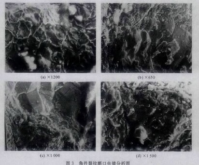 針對角件上出現(xiàn)的裂紋我們解剖取樣,發(fā)現(xiàn)裂紋斷口暗色,有氧化跡象。借助電鏡分析裂紋斷口和裂紋附近表面,如圖3a,從裂紋斷口上能看到成網(wǎng)狀的硫化物,其含S量為3%;從裂紋附近表面圖3b反映在表面有富硫晶體存在,其S含量為27%,而材質(zhì)中的S含量為0.02%,斷口和裂紋附近表面都說明在出現(xiàn)裂紋表面存在一個富硫層,這個富硫層使鑄件表層機械強度降低。而富硫層中的硫主要來源于型砂,型砂中的固化荊對甲苯磺酸含有硫,對甲苯磺酸在高溫下分解產(chǎn)生S滲透到鑄件表層。