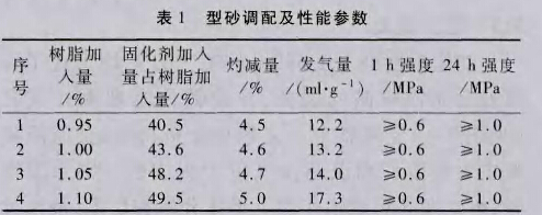 某公司一直采用呋喃樹脂砂批量生產(chǎn)鑄鐵件,回收的舊砂性能參數(shù)為:粒度40~70日所占質(zhì)量百分比為85.0%~90.0%;灼減量為3.8%~4.5%;粉塵量不大于1.0%;發(fā)氣量為17.0~19.0ml/g??紤]到舊砂回收比率高將導(dǎo)致發(fā)氣量大,而全新砂調(diào)配的型砂硬化時間長,生產(chǎn)效率不高等實(shí)際情況,在原舊砂的基礎(chǔ)上添加50.0%新砂對型砂進(jìn)行調(diào)配。其中,新砂Si0,不小于98.0%,粒度為40~70目,通過調(diào)整無氮樹脂加入量和固化劑加入量后檢測其性能,結(jié)果如表1所示。