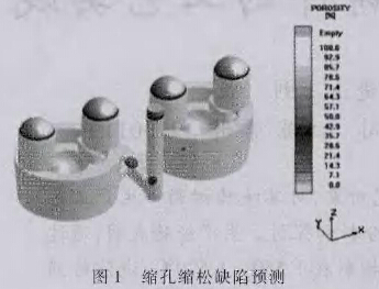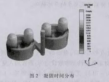 采用MAGMA軟件對其凝固過程進(jìn)行模擬分析,結(jié)果表明,鑄件部位出現(xiàn)縮孔縮松缺陷的傾向較小,縮孔缺陷主要集中在澆道和冒口中,如圖1所示;鑄件基本遵循如圖2所示的“冷鐵部位一冒口下部區(qū)域一冒口”的凝固順序。